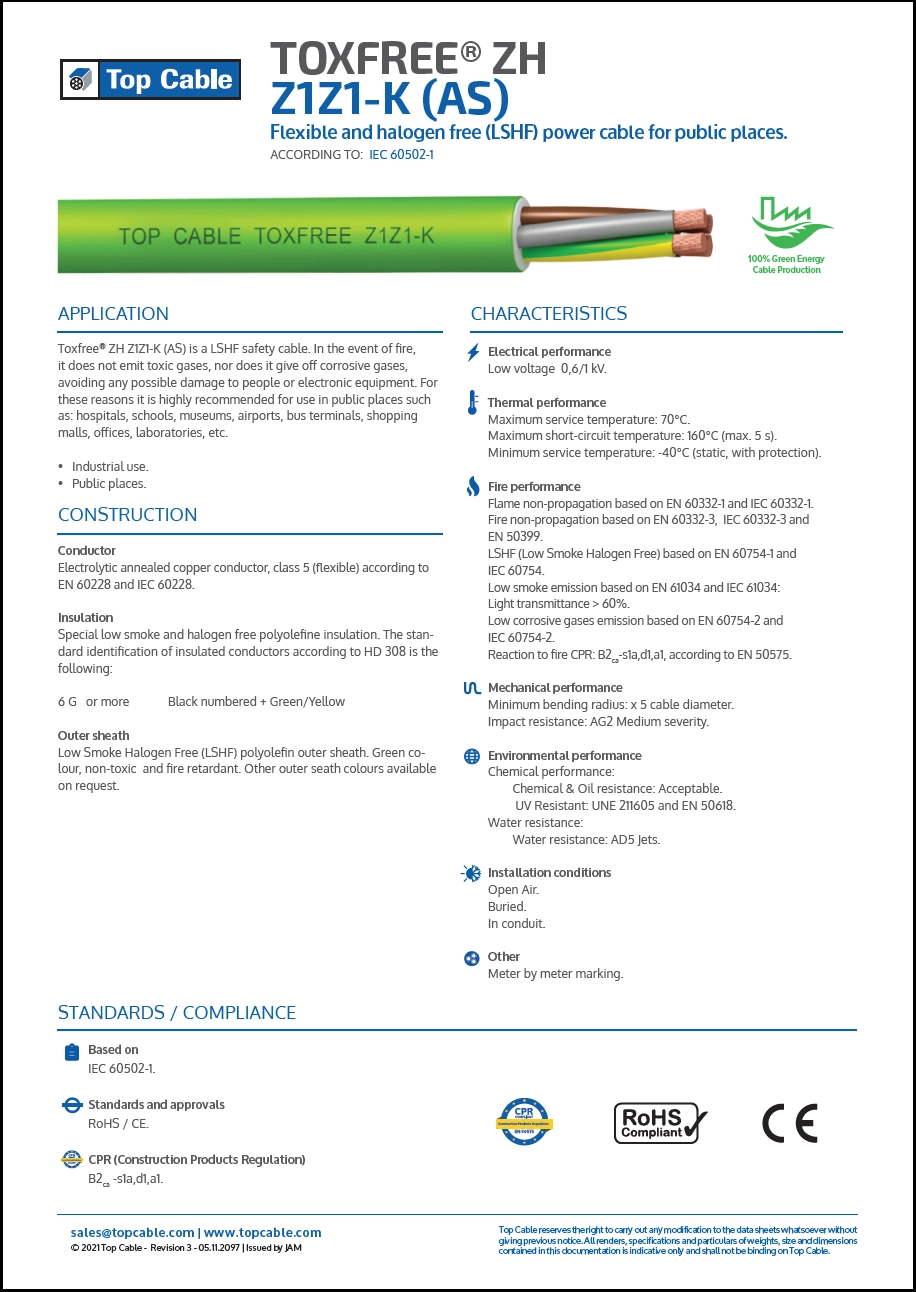 LSHF (Low Smoke Halogen Free) based on EN 60754-1 and IEC 60754.