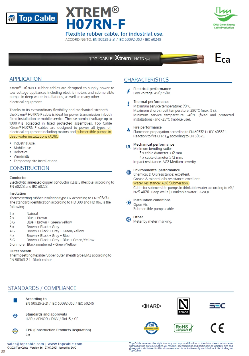 Cable for submersible pumps in drinkable water according to AS/ NZS 4020.