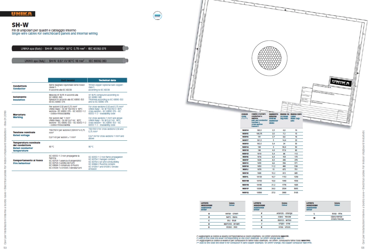 UNIKA (Italy) – SH-W 0,6/1 kV 90°C cross-section – IEC 60092-353 – IEC 60332-1-2 – traceability code